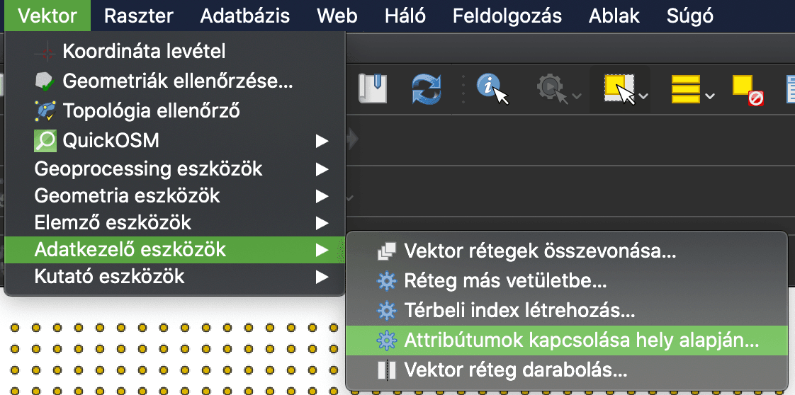 Ezután hozzácsatoltam Baranya Megye járásait, amit a Vektor, Adatkezelő eszközök, Attribútumok kapcsolása hely alapján menüpontból lehet elérni.
