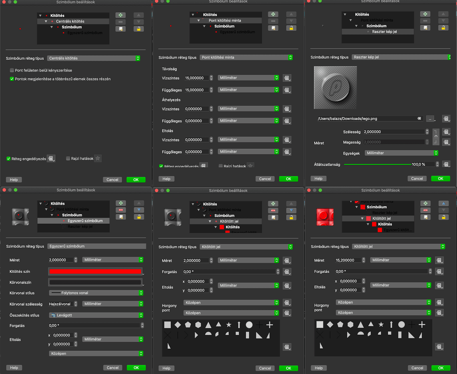 Ezután a szimbólum menüpontra kattintva ki kell választani a pont kitöltési mintát. A szimbólumnál be kell állítani a "Raszter kép jel" opciót, majd feltölteni a Lego képet és beállítani a távolság értéket. Ez utóbbit úgy kell beállítani, hogy a raszter kép jelek éppen összeérjenek. Ezután egy új kitöltési mintát kell hozzáadni (kitöltött jel) a panelen jobb felül található zöld plusz ikonnal, amit a raszter kép jel alá kell mozgatni (az áttetsző kép lesz felül). A raszter kép méretének megfelelő méretet kell megadni és a négyzet alakzatot kell kiválasztani. A kitöltés színe nem számít.