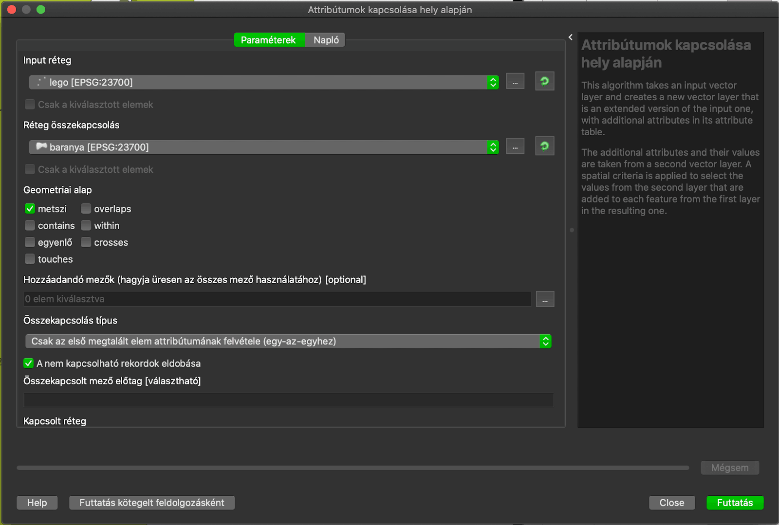 Itt az input réteg a létrehozott "Szabályos pontok" rétege, Réteg összekapcsolás "baranya", geometria alap a "metszés". Fontos, hogy az összekapcsolás típusánál az első megtalált elem szerepeljen, a nem kapcsolt pontok pedig kerüljenek eldobásra.