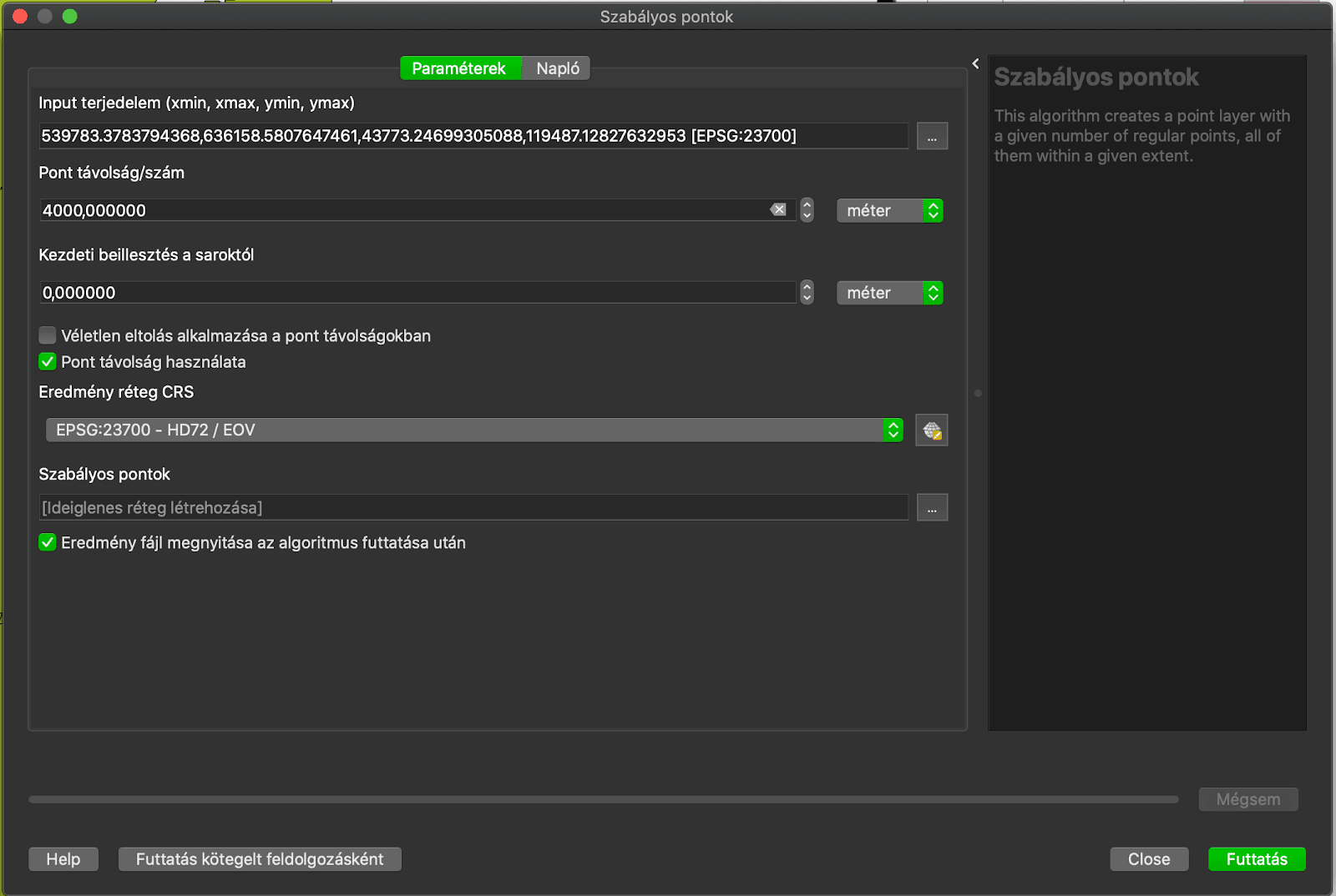 Terjedelemnek a réteg terjedelmét, pont távolságnak 4000 métert állítottam be és ideiglenes rétegbe mentettem az adatokat.