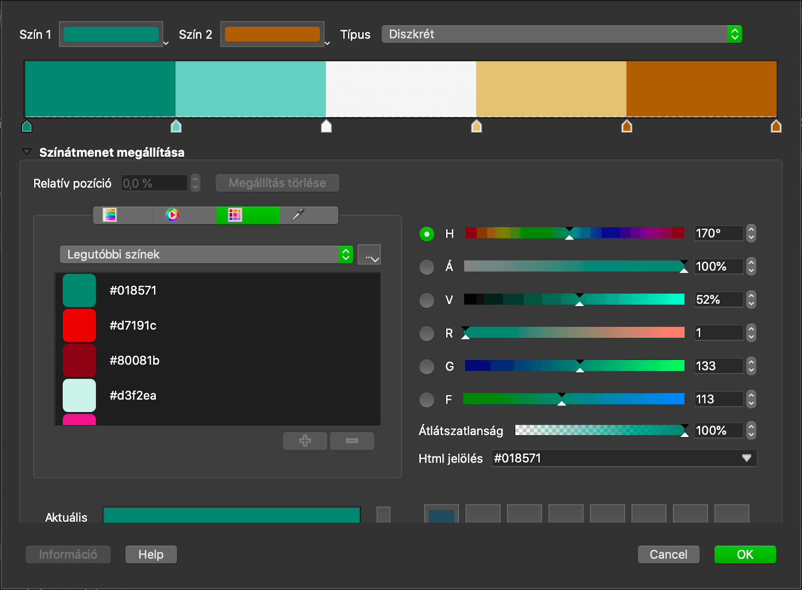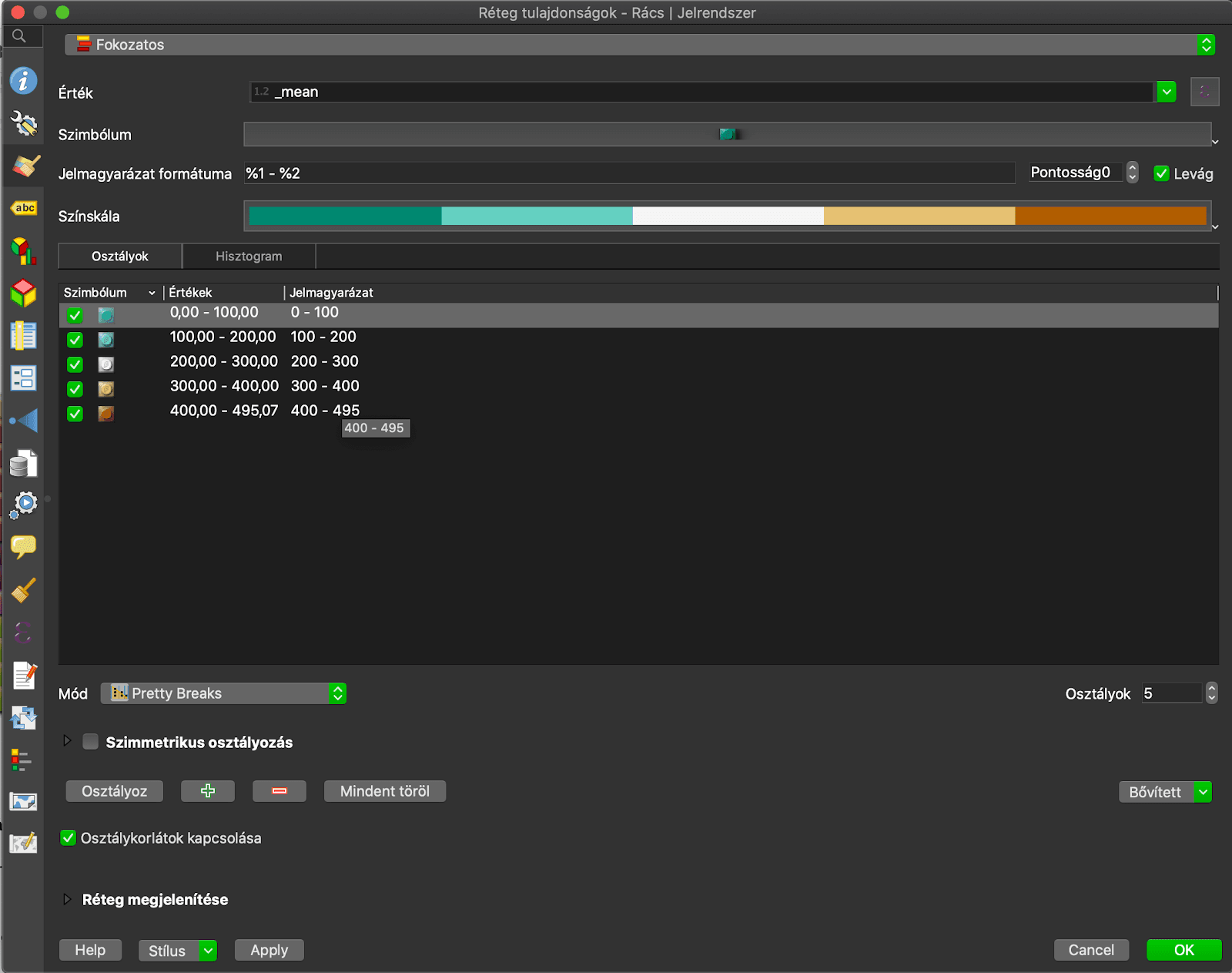 Ez után a színskálát kell megadni. Ha minden jól sikerült, akkor az osztályoz menüpontra kattintva az alábbi panelt kapjuk.