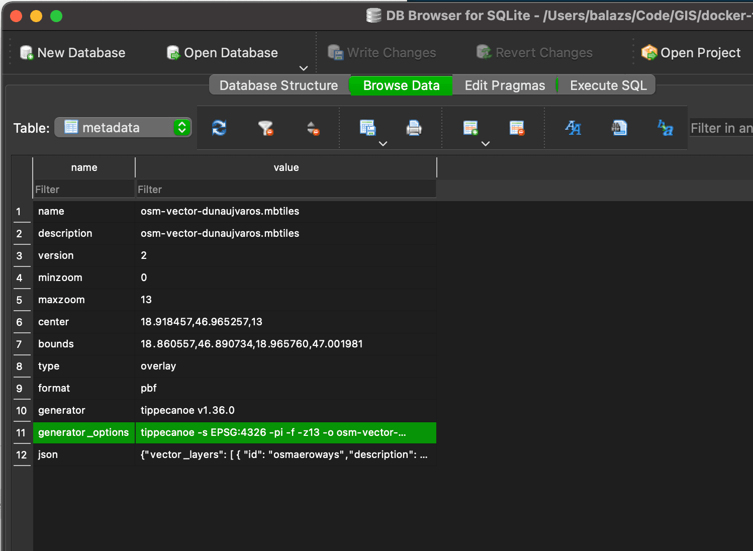 A kimenetként megadott MBTiles fájlt a DB Browser for SQLite programmal módosítom, törlöm a metadata táblából a "generator_options" recordot (Tileserver-php fájlban okoz hibát).