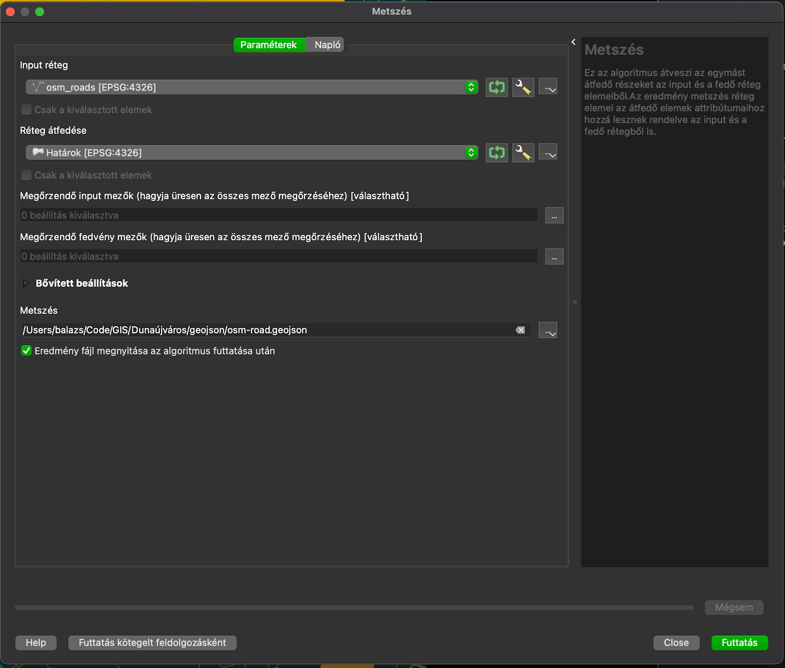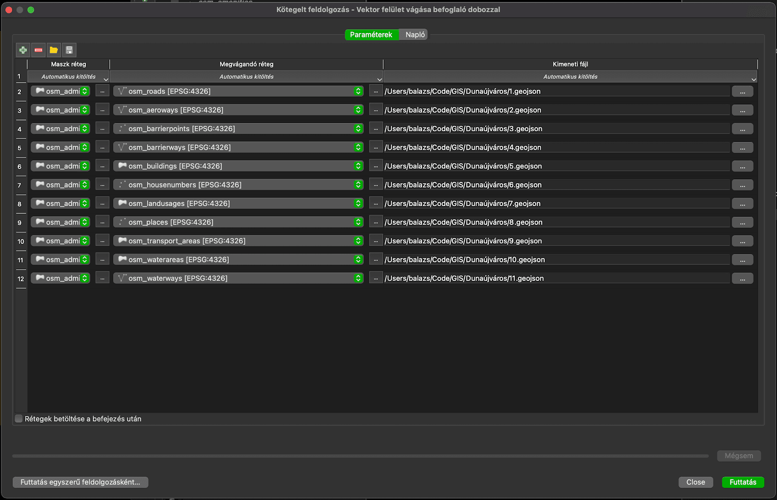 Az adminisztrációs réteget leszűrtem Dunaújvárosra, majd készítettem egy befoglaló téglalapot, ezután a OSM rétegeit elvágtam ezzel a téglalappal, amit kimentettem egy-egy json fájlba.